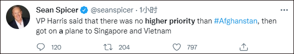 美國保守派媒體“Newsmax”主持人肖恩·史派瑟(Sean Spicer)則寫道:“哈里斯嘴上説沒有什麼比阿富汗問題更重要了,卻還是乘飛機去了新加坡和越南。”