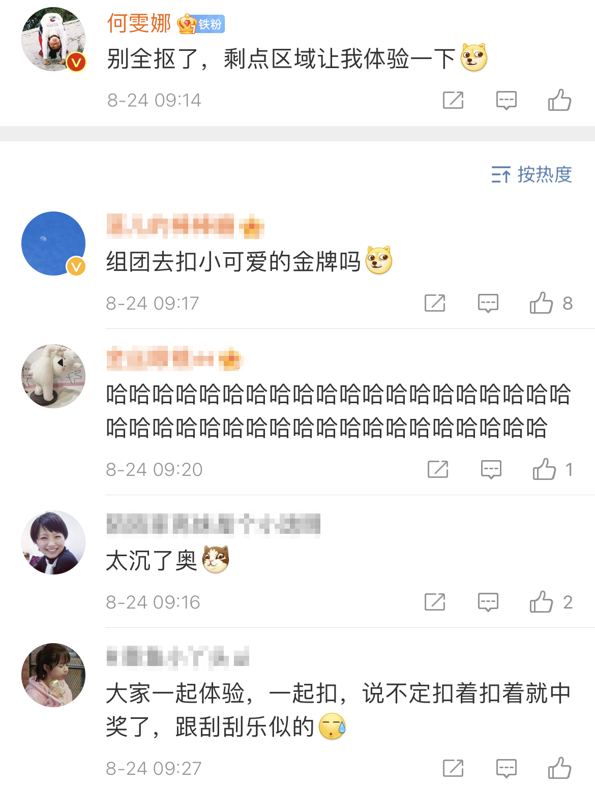 朱雪瑩的好姐妹,中國前女子蹦牀運動員@何雯娜:別全摳了,留點給我摳。