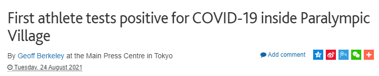 (觀察者網訊)8月24日是東京2020年殘奧會開幕的日子,而就在當天,英國奧運新聞網站“Inside the Games”報道稱,一名運動員在殘奧村被檢測出感染了新冠病毒。這是殘奧村內首次有運動員被確診感染新冠病毒。