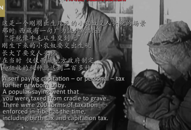 紀錄片還展示了一個剛剛出生幾天的小農奴交人頭税的場景。那時,西藏有一句廣為流傳的諺語:“苛税像牛毛,從生交到死”。剛生下來的小農奴要交出生税,長大了要交人頭税。在當時,僅僅西藏地方制定和徵收的税種就達到二百多種。