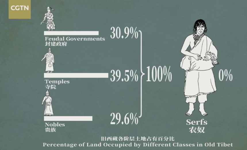 據紀錄片介紹,在舊西藏,農奴及奴隸占人口的95%,其餘5%為三大領主。三大領主包括官家,貴族和寺院上層僧侶。當時,神權至上,政權庇護神權,神權控制政權,神權與政權融為一體,達賴喇嘛是最高統治者。