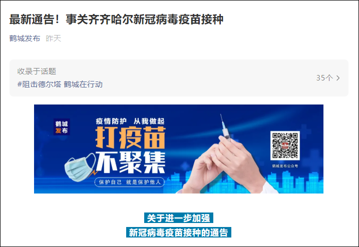 據“鶴城發佈”微信公眾號消息,8月24日,齊齊哈爾市應對新型冠狀病毒感染肺炎疫情工作領導小組指揮部發布關於進一步加強新冠病毒疫苗接種的通告。