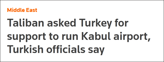 報道稱,一名土耳其高級官員表示,雖然塔利班已經請求土耳其在運營喀布爾機場方面提供技術支持,但也要求所有土耳其軍隊完全撤離阿富汗,這將使任何未來的任務複雜化。