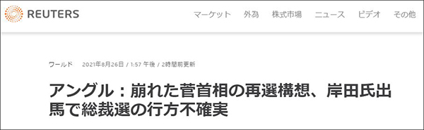 “菅義偉當初的連任構想崩塌了”,路透社如此評論道。