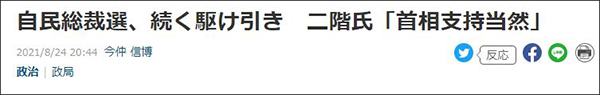 現任日本首相、自民黨總裁的菅義偉因新冠疫情、舉辦奧運會等問題倍受批評,而其內閣民意支持率近期持續走低。在此情況下,即將舉行的日本自民黨總裁選舉懸念驟生。