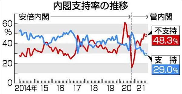 首先,菅義偉的民意支持率在不斷下滑。日本時事通信社8月20日發佈特刊文章中的數據顯示,截至20日,菅義偉內閣的支持率繼續下滑至29%,而不支持率則攀升至48.3%;日本《產經新聞》的輿論調查也顯示出類似傾向,菅義偉內閣支持率降至32.1%。