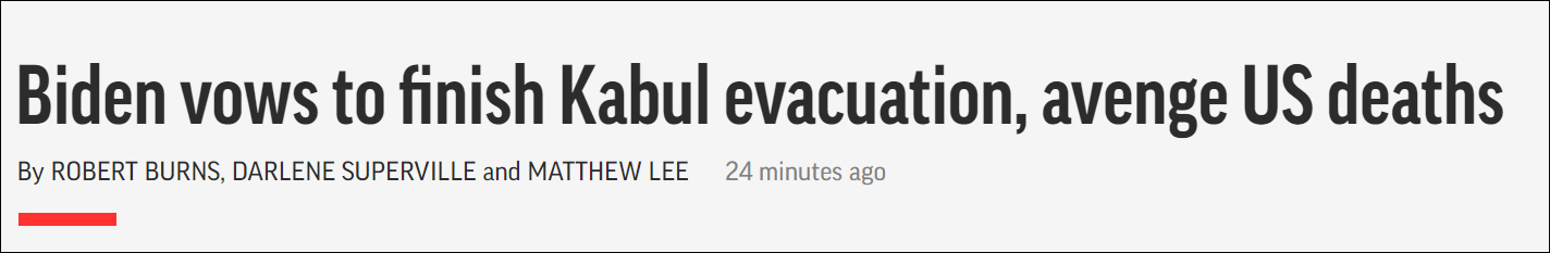 拜登表示,“我們將在我們選擇的時間,我們選擇的地點以武力和精確的方式做出反應,這些恐怖分子不會獲勝。我們將拯救美國人;我們將讓我們的阿富汗盟友撤離,我們的使命將繼續。美國不會被嚇倒。”