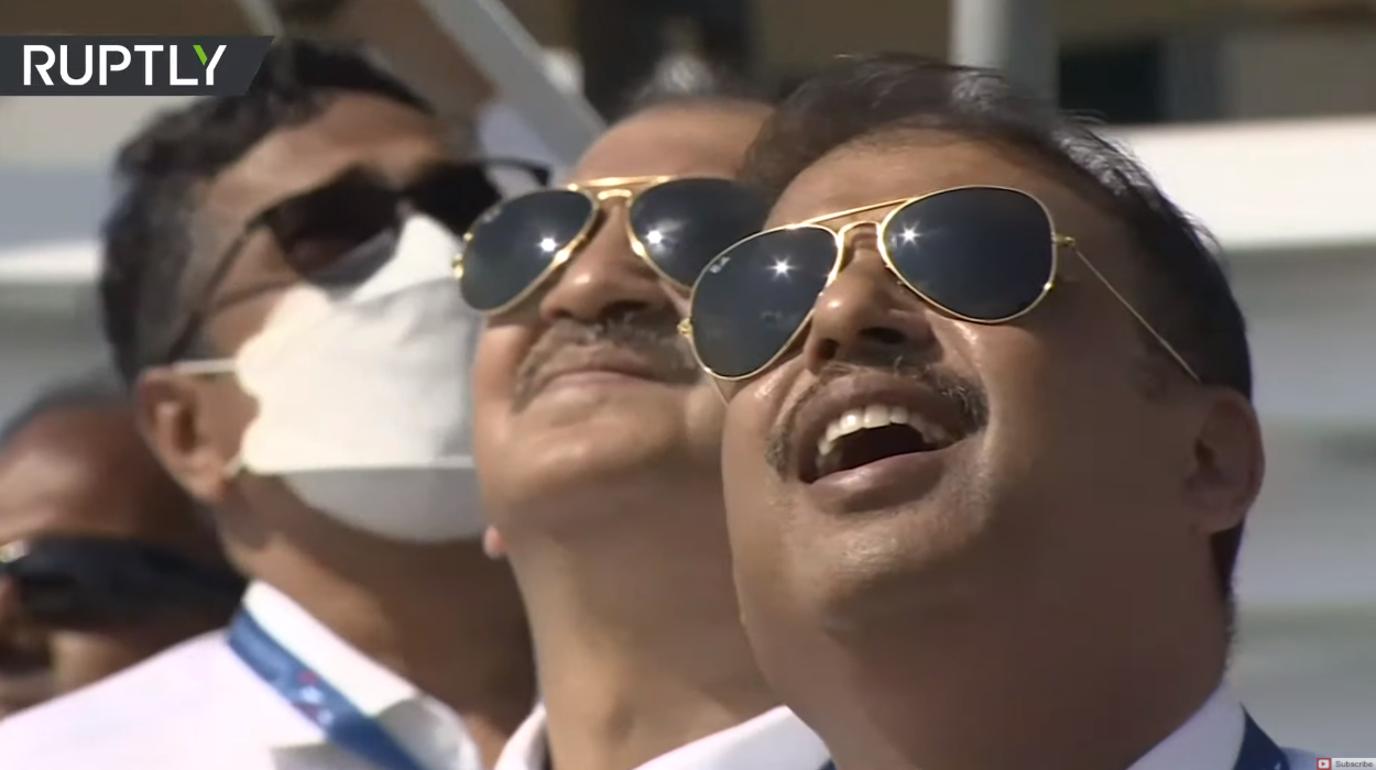 印度代表團人員觀看莫斯科國際航空航天展上的飛行表演