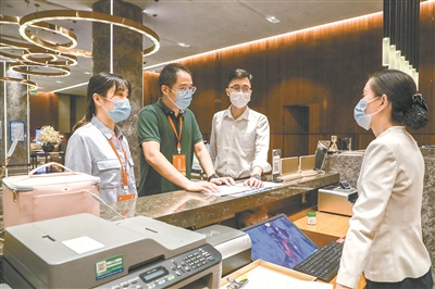 江蘇省宜興市紀委監委緊盯隱形變異“四風”問題,聯合有關部門組成專項督查組到酒店、餐館等處開展監督檢查,通過調閲財務賬冊、消費明細、發票底單等查找有關線索,嚴查違規吃喝問題。圖為近日,督查組在某酒店瞭解情況。褚亮 攝