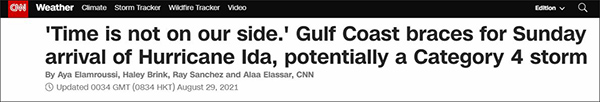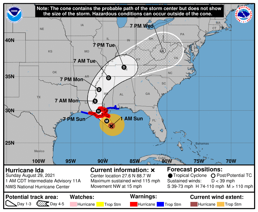 美國國家颶風中心(National Hurricane Center)網站當地時間29日凌晨1點發布的最新數據顯示,“艾達”目前是3級颶風,風速為115英里/小時(約為185km/h),預計它此後還會增強並將於當地時間29日13時在路易斯安那州登陸,目前該州等多地已發出颶風警報。CNN也稱,當在路易斯安那州海岸登陸時,屆時它將會“極其危險”(extremely dangerous)。