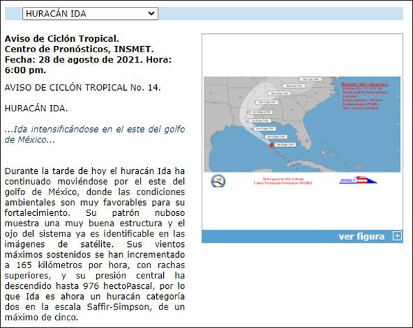古巴氣象研究所28日下午18時稱,颶風中心已離開古巴,並以每小時 26 公里的速度向西北移動。同時還提到,儘管“艾達”繼續遠離古巴,但它仍將繼續影響古巴西部地區,並引發降雨和雷暴。
