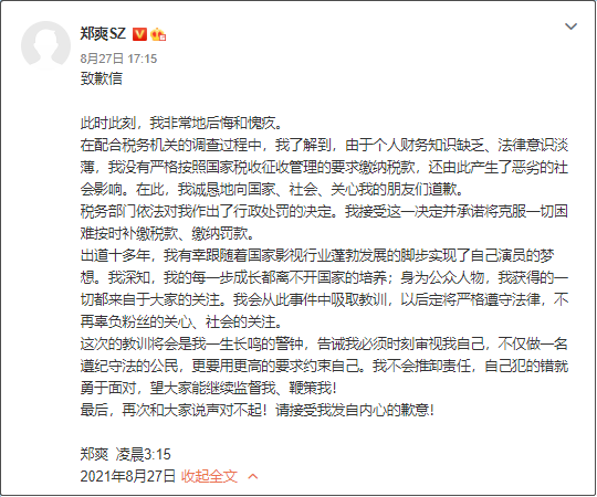 在8月27日凌晨發佈的道歉聲明中,鄭爽表示:“由於個人財務知識缺乏、法律意識淡薄,我沒有嚴格按照國家税收徵收管理的要求繳納税款,還由此產生了惡劣的社會影響。”