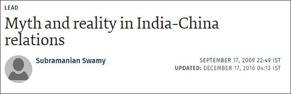 斯瓦米曾於2009年在《印度教徒報》(The Hindu)上刊文稱,“儘管中印兩國是鄰國,但直到1962年,兩國間從未發生戰爭,經濟活動也十分活躍。這是世界文明史中最非凡、最無與倫比的睦鄰友好。”他還稱,“兩國人民進行貿易、互訪、相互借鑑,並且普遍相互尊重。”