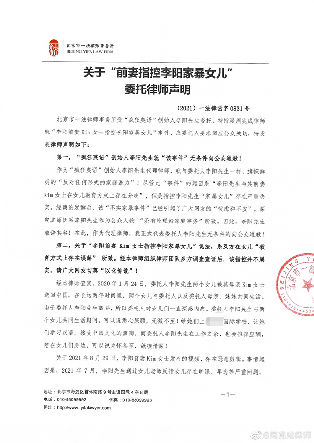 8月31日,“瘋狂英語”創始人李陽委託代理律師@周兆成律師 發佈關於“前妻指控李陽家暴女兒”委託律師聲明,聲明稱李陽就此事無條件向公眾道歉,否認前妻Kim所指控的“家暴女兒”,稱系雙方在女兒“教育方式上存在誤解” 所致,並表示Kim發佈的視頻存在惡意剪輯,事情起因是女兒存在曠課、早戀等問題,他在教育女兒時發生“激烈的言語爭執”。