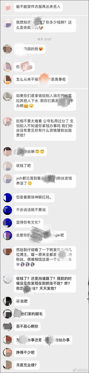 從@極目新聞 發佈的截圖來看,留言中不僅充斥着言語粗俗的謾罵攻擊,還有粉絲將其成為“營銷號”,罵媒體“一看就收了錢”,稱這是“公器私用”,還指控關於蔡徐坤的報道是“無證據造謠”。