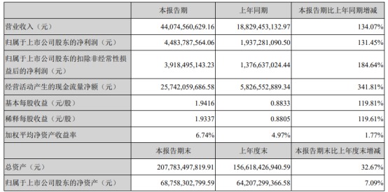 8月25日晚,它終於公佈半年報:營收收入440.75億元,同比增長134.07%;歸母淨利潤44.8億元,同比增長131.45%,可以説是一份出色的成績單。