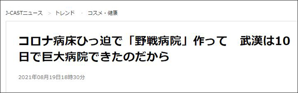 日本新聞網站“J-CAST”8月19日刊文稱,在中國武漢多地都建有“規模龐大的臨時醫療設施”即方艙醫院,供新冠患者接受住院治療。而日本政府動作如此遲緩,在發生疫情1年半後仍然沒有建設(方艙醫院)的計劃,導致民眾呼聲越來越高。