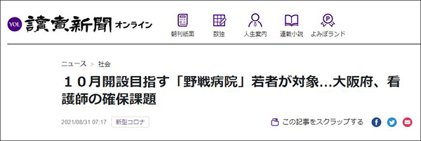 據《讀賣新聞》等多家日媒今天(31日)報道,日本大阪府知事吉村洋文30日稱,當地正計劃於10月中旬建設一個擁有1000張病牀的“野戰醫院”,屆時將主要收治無法住院治療以及無法在酒店集中療養的40歲以下年輕感染者。