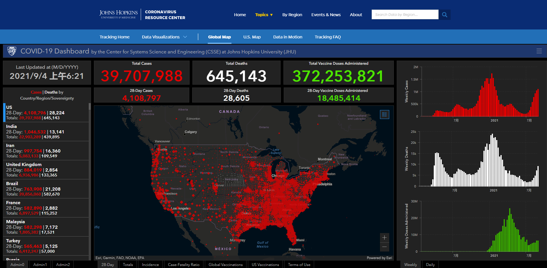 (觀察者網訊)根據美國約翰斯·霍普金斯大學統計數據,截至北京時間2021年9月4日6時21分,美國新冠肺炎累計確診病例達39707988例,累計死亡病例645143例。在過去約24小時裏,美國新增確診病例185321例,新增死亡病例1666例。