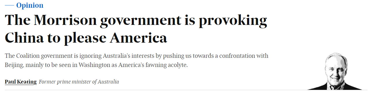 “莫里森政府正不負責任地推動澳大利亞與中國進行不必要的正面對抗——而這麼做的目的主要就是為了讓華盛頓視自己為一個恭順的隨從。”保羅·基廷寫道,“澳大利亞有關獨立外交政策權利、可以‘成為自己’併為本國利益行事的權利,正被一個決意要將本國利益置於他國利益之下的政府所取代。”