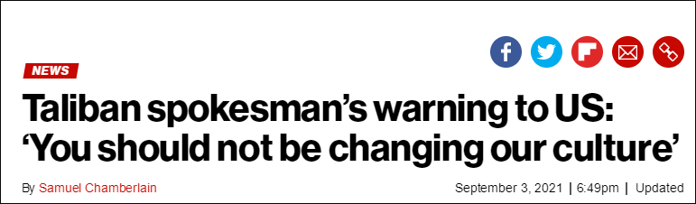 (觀察者網訊)“我們沒打算改變你們的文化,你們也不該改變我們的文化。”《紐約郵報》(New York Post)9月3日報道稱,這是塔利班發言人對美國政府的警告。