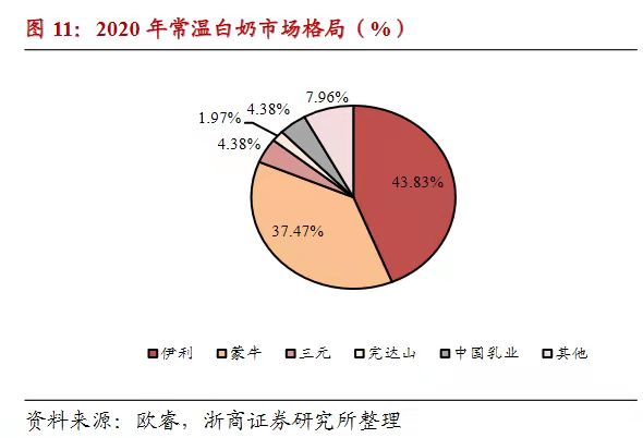 據浙商證券研報,2020年我國常温白奶市場格局中,伊利和蒙牛的市佔率分別約為43.83%、37.47%。