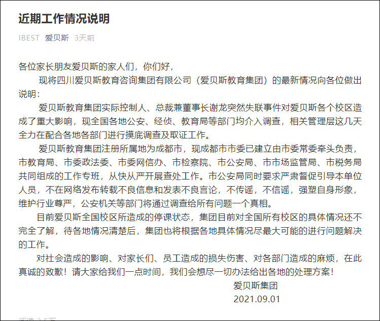 到了9月1日,愛貝斯再次發佈聲明稱,該集團實際控制人、總裁兼董事長謝龍突然失聯事件對愛貝斯各個校區造成了重大影響,現全國各地公安、經偵、教育局等部門均介入調查,相關管理層這幾天全力在配合各地各部門進行摸底調查及取證工作。
