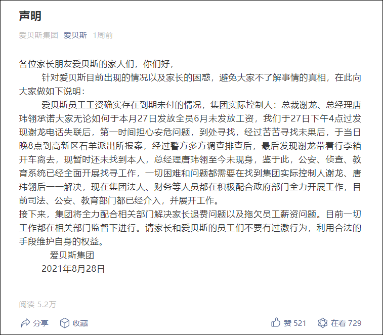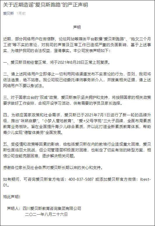 8月26日,愛貝斯在其官方微信公眾號發佈聲明稱,近期,部分網絡用户在微信羣、論壇網站等媒體平台散播“愛貝斯跑路”、“拖欠三個月工資”等不實的言論,對愛貝斯的聲譽及正常工作已造成嚴重的負面影響。聲明中,愛貝斯稱,該公司目前經營正常,將於2021年8月28日正常上班復課。