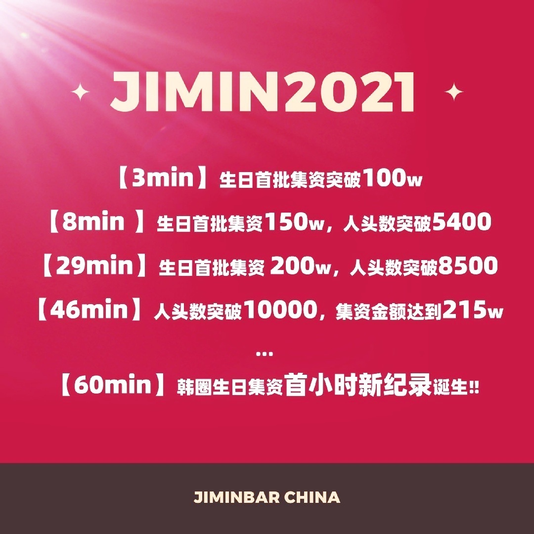 據百度樸智旻吧統計,2021年樸智旻生日首批集資首日,3分鐘突破100萬元人民幣,46分鐘“人頭數”突破1萬,集資金額達到215萬,首小時金額達到2302579元,是“韓圈生日集資首小時新紀錄”。