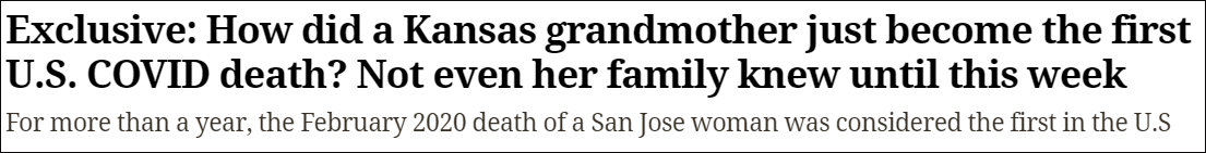 美媒《聖何塞信使報》(The Mercury News)9月3日發佈獨家消息,美國堪薩斯州萊文沃斯(Leavenworth)一名婦女在去世17個月後死亡證明被修改,死亡原因增加了感染新冠肺炎。這使得美國第一例新冠死亡病例發生時間提早到了2020年1月9日。此前,美國首例新冠死亡病例一直被認為發生在2020年2月6日,死者是一名來自西海岸聖荷西市的婦女。