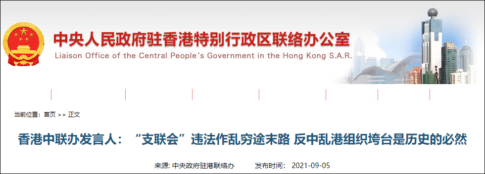 據香港中聯辦官網9月5日消息,中央人民政府駐香港特別行政區聯絡辦公室發言人5日發表談話指出,反中亂港組織“支聯會”今日宣佈啓動解散表決程序,其解體已是“政治事實”,實際上今年以來該組織分崩離析早成“殭屍”,走向徹底滅亡只是時間問題。在今日香港法治環境和歷史大勢下,一切反中亂港組織都不會再有作亂空間,其垮台是大勢所趨、人心所向。我們堅決支持香港特區政府及警方深入調查、依法追究、除惡務盡,堅定捍衞法治尊嚴,全力維護香港長治久安。