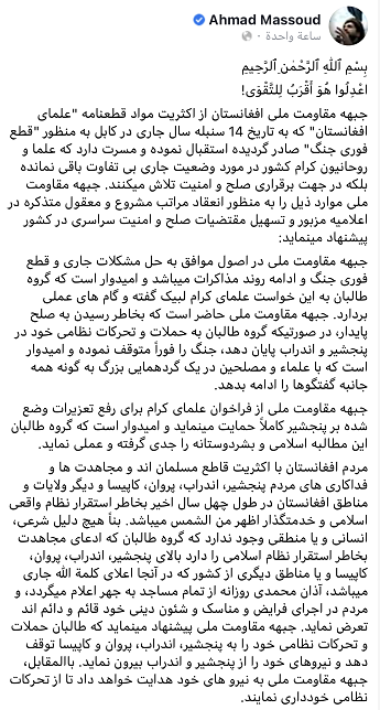 當地時間9月5日,阿富汗反塔利班力量“民族抵抗陣線”領導人艾哈邁德·馬蘇德在社交媒體上發表聲明稱,如果塔利班停止在潘傑希爾省和巴格蘭省安達拉布地區的軍事行動,“民族抵抗陣線”願停止戰鬥,開啓談判。