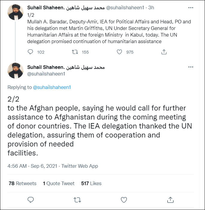 沙欣表示,塔利班外事部門代表團今天(5日)在喀布爾會見了聯合國負責人道主義事務的副秘書長馬丁·格里菲斯。格里菲斯承諾繼續向阿富汗人民提供人道主義援助,並表示他將在即將召開的援助國會議上呼籲進一步向阿富汗提供援助。塔利班代表團感謝了聯合國代表團,並向他們保證合作和提供所需的物資。