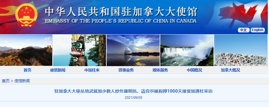 中國駐加拿大大使館網站9月5日消息,2021年9月4日,駐加拿大大使叢培武接受加最大通訊社——加通社電話採訪指出,最近加方少數政客和媒體等炒作加公民康明凱、邁克爾被中方拘押1000天,對中國司法機關依法辦案進行無端指責。這嚴重干涉中國司法主權,中方對此表示堅決反對。