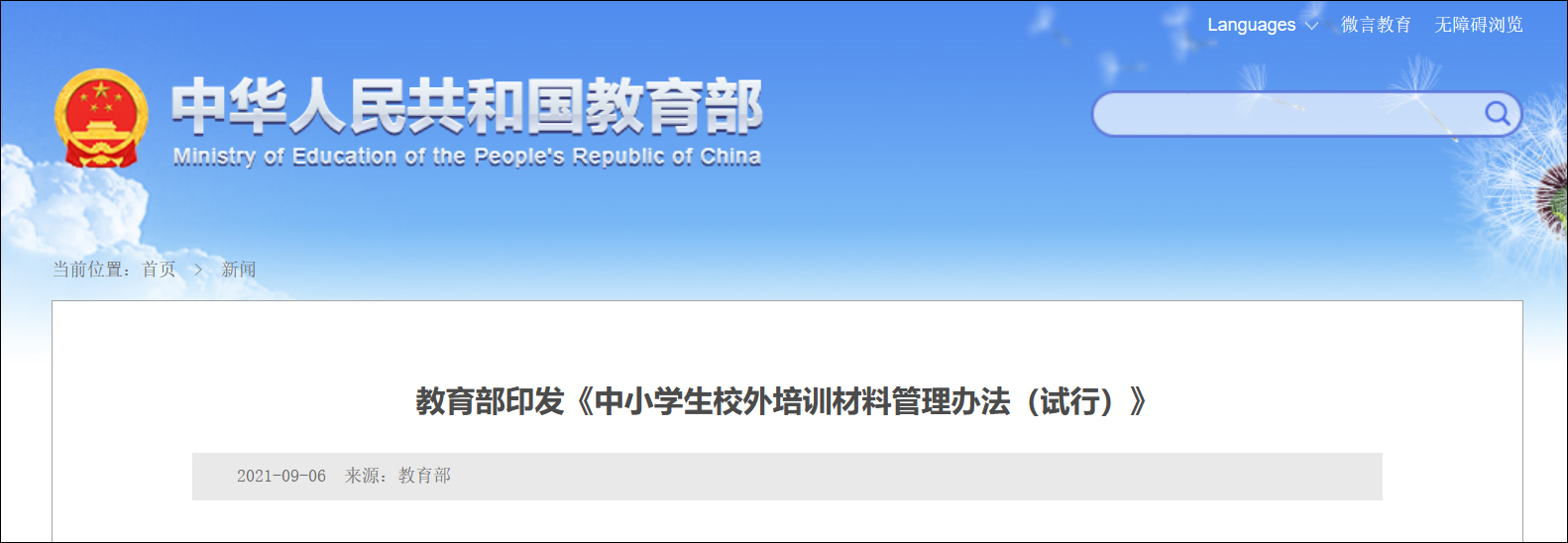 據教育部網站9月6日消息,為深入貫徹中央《關於進一步減輕義務教育階段學生作業負擔和校外培訓負擔的意見》的決策部署,落實立德樹人根本任務,全面加強校外培訓監管,強化中小學生校外培訓材料管理,教育部日前印發了《中小學生校外培訓材料管理辦法(試行)》(以下簡稱《管理辦法》)。