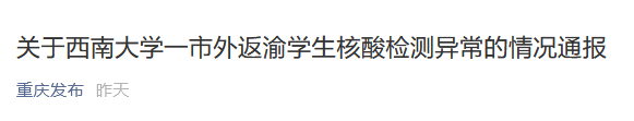 9月6日,“重慶發佈”微信公眾號發佈《關於西南大學一市外返渝學生核酸檢測異常的情況通報》: