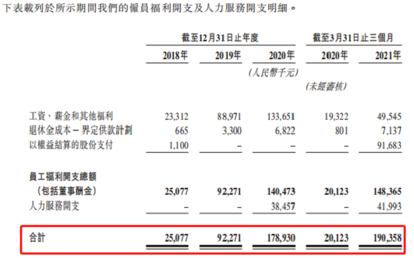 2019-2020年,該公司的僱員福利及人力服務開支分別為9227.1萬元、1.79億元,同比增長267.95%、93.92%;2021年一季度,這部分支出同比增速達到845.97%。