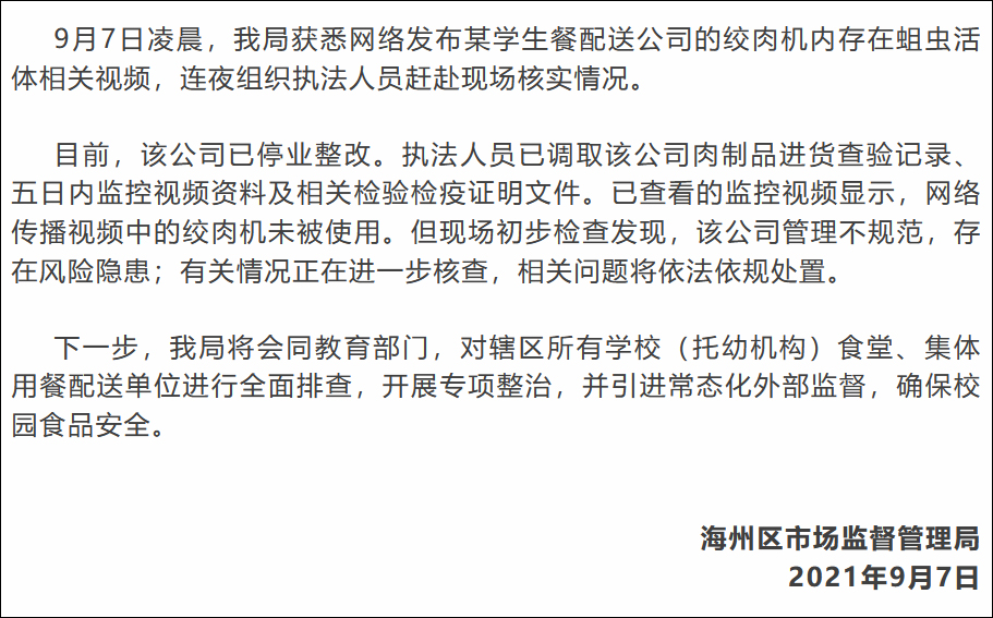 據“連雲港發佈”微信公眾號7日消息,海州區市場監督管理局發佈通告稱,9月7日凌晨,海州區市場監督管理局獲悉網絡發佈某學生餐配送公司的絞肉機內存在蛆蟲活體相關視頻,連夜組織執法人員趕赴現場核實情況。
