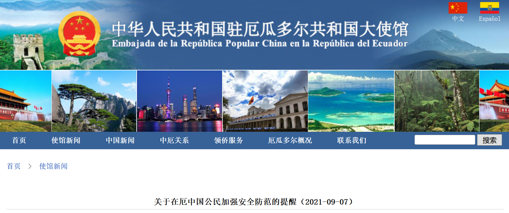 9月7日,中國駐厄瓜多爾大使館網站發佈關於在厄中國公民加強安全防範的提醒,以下為全文: