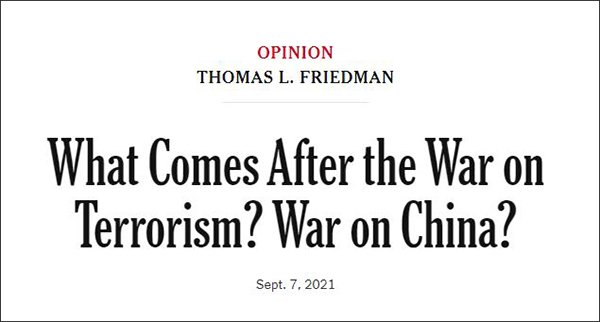 美國《紐約時報》當地時間9月7日刊登了外交事務專欄作者、普利策獎終身評審托馬斯·弗裏德曼(Thomas Loren Friedman)的文章,原標題為《反恐戰爭之後是什麼?對華戰爭?》。