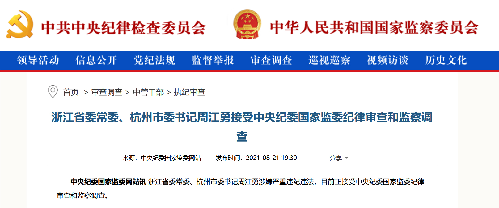 據“中國新聞週刊”微信公眾號9日消息,8月21日晚7時30分,中央紀委國家監委官網發佈消息:浙江省委常委、杭州市委書記周江勇涉嫌嚴重違紀違法,目前正接受中央紀委國家監委紀律審查和監察調查。