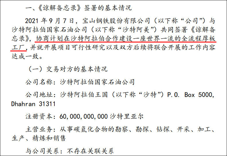 9月8日,中國寶武旗下子公司寶鋼股份發佈公告,稱該公司日前與世界最大石油生產公司沙特阿美(Aramco)簽署諒解備忘錄,雙方協商計劃在沙特阿拉伯合作建設一座世界一流的全流程厚板工廠,並就開展項目可行性研究以及雙方後續將聯合開展的工作內容達成一致。