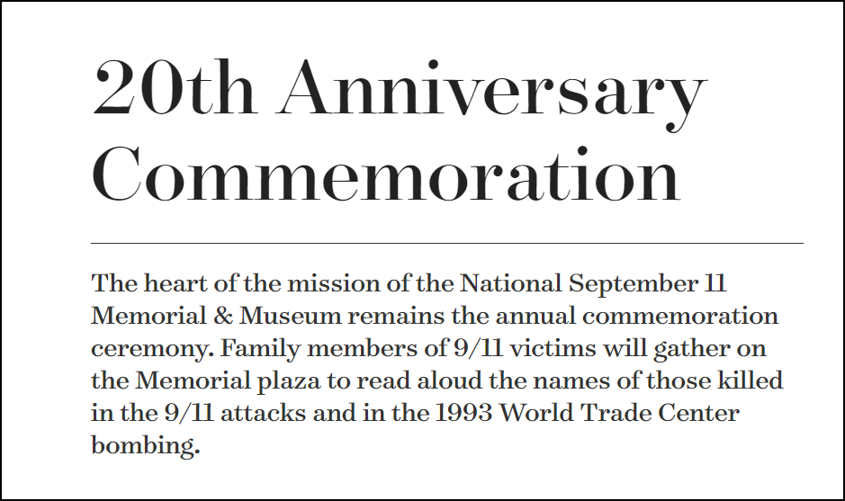 據“9•11”紀念博物館官網稱,組織遇難者家屬在“9•11”紀念廣場上大聲朗讀遇難者名字的活動,此活動將於當地時間11日8時30分開始,並在8時46分進行第一次默哀。