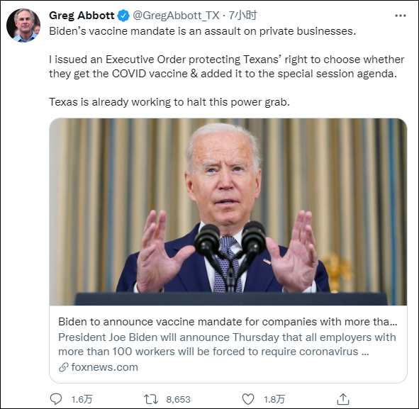 他還表示,將盡其所能“要求更多美國人接種疫苗,以對抗那些阻礙公共衞生的人”。這裏指的就是禁止強制要求佩戴口罩或接種疫苗嘗試的共和黨籍州長。