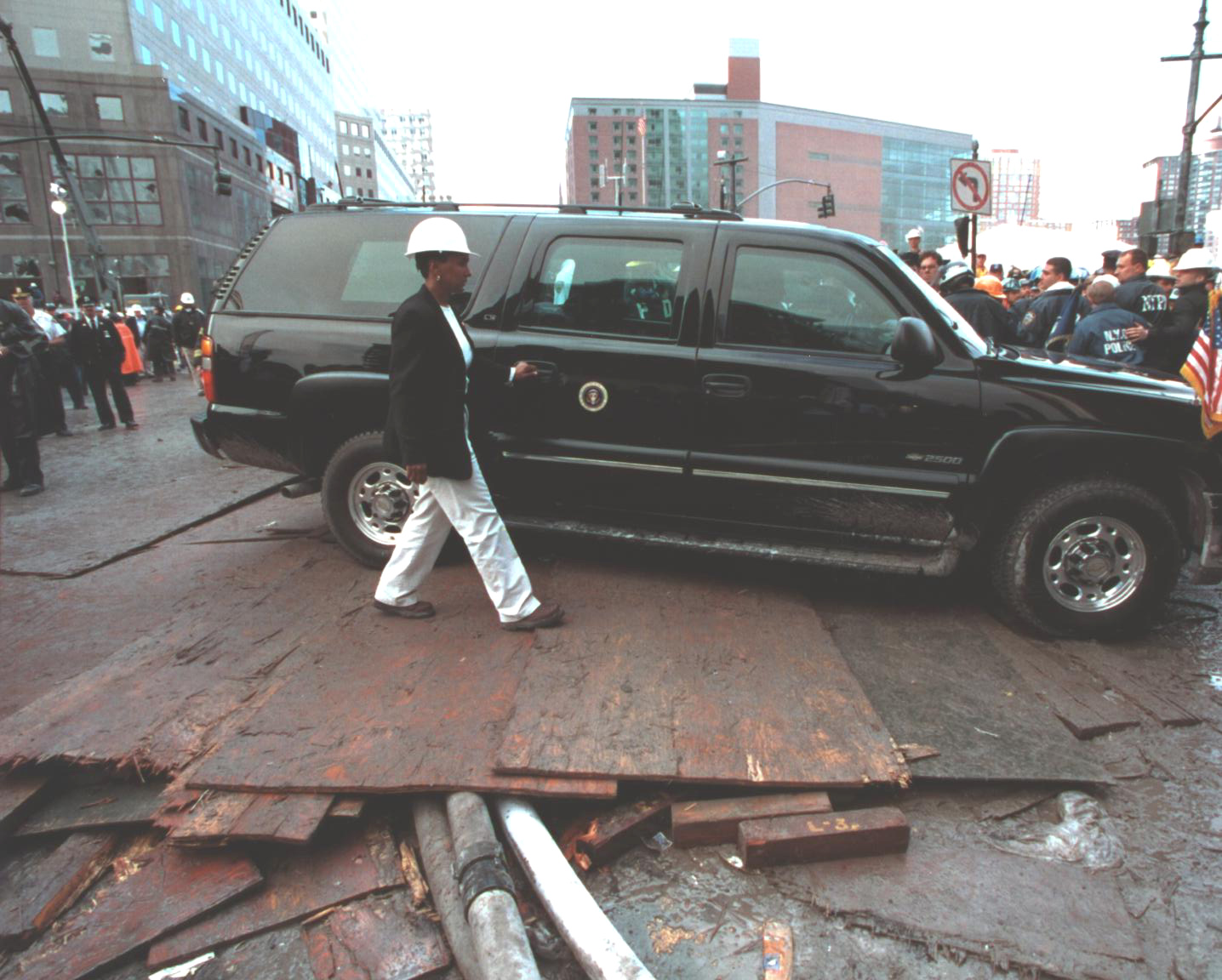 2001年9月14日,時任總統小布什在特勤局官員的陪同下查看現場。圖自美國特勤局