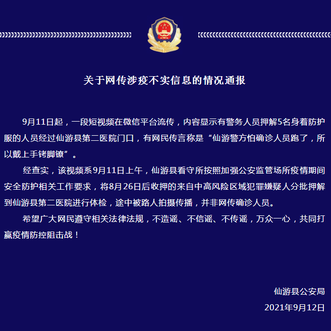 9月12日,福建莆田市仙遊縣公安局通報稱,9月11日起,一段短視頻在微信平台流傳,內容顯示有警務人員押解5名身着防護服的人員經過仙遊縣第二醫院門口,有網民傳言稱是“仙遊警方怕確診人員跑了,所以戴上手銬腳鐐”。
