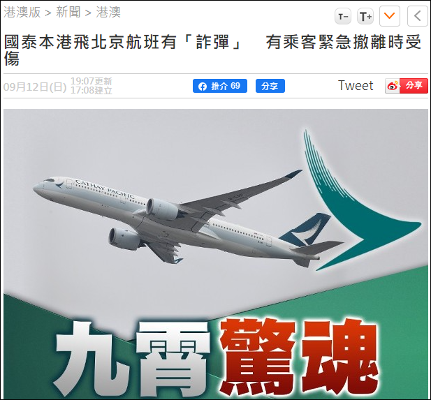 據報道,涉事航班為國泰航空CX390航班。就此,國泰航空發言人回覆稱,CX390航班昨天在北京降落後,由於有關部門收到安全威脅信息,為謹慎起見,因而啓動了緊急滑梯撤離乘客及機組人員。少數乘客在過程中輕微擦傷,已獲得治療,毋須送院。發言人還表示,“詐彈”事件並未影響航班安全,會繼續為受影響的乘客提供協助及支援,並繼續與有關部門合作調查事件。