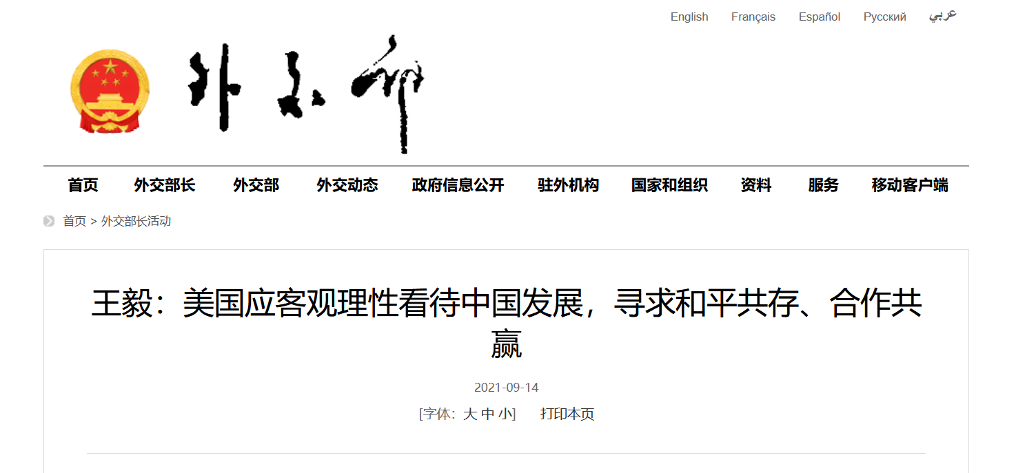 王毅指出,世界上也有一些國家和勢力很不適應中國發展,抱有各種各樣疑慮,甚至產生嚴重誤判。這既不利於促進合作,也影響發展正常關係。美國可能就正處於這樣的過程中。美方應該意識到,世界上不僅美國有發展權利,其他國家也有發展的權利;不僅美國人民有權過上幸福生活,其他各國人民也有權過上幸福生活。2000多年前中國古人就講,“萬物並育而不相害,道並行而不相悖。”世界應該是豐富多彩的,大家都發展才是真發展,才是可持續的發展。不能只讓一個或幾個國家發展,而其他國家都處於貧窮當中。這既不公平,也不符合人類的基本良知。