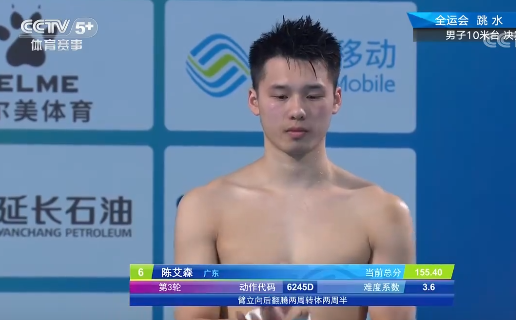 沒想到第六輪,陳艾森拿出了自己世界一流的動作完成度,上演驚天逆轉,用完美的空中姿勢和落水拿到100.80分,終於“破百”,以總分512.55鎖定獎牌。