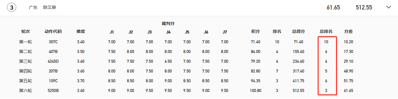 第五輪,陳艾森憑藉109C難度3.7的動作,終於跳出自己的水準,但這輪過後,他只排在第六,眼看着就要無緣獎牌。